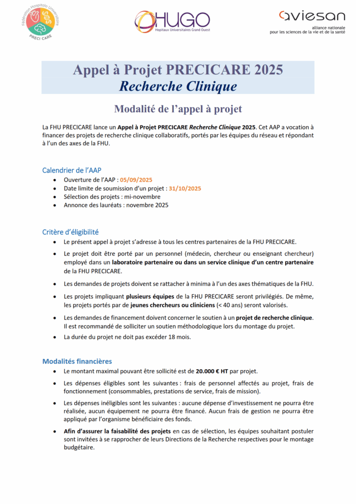 Ouverture de l’appel à Projet PRECICARE Recherche Clinique – 2025